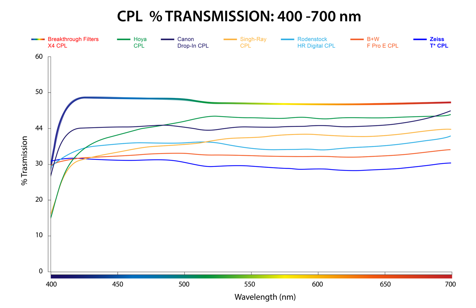 A perfectly flat light transmission curve would yield a perfectly color neutral result. While this is technically impossible, the X4 CPL has the flattest transmission curve of any polarizer on the market - guaranteed. This translates into a more color neutral performance without a color cast.