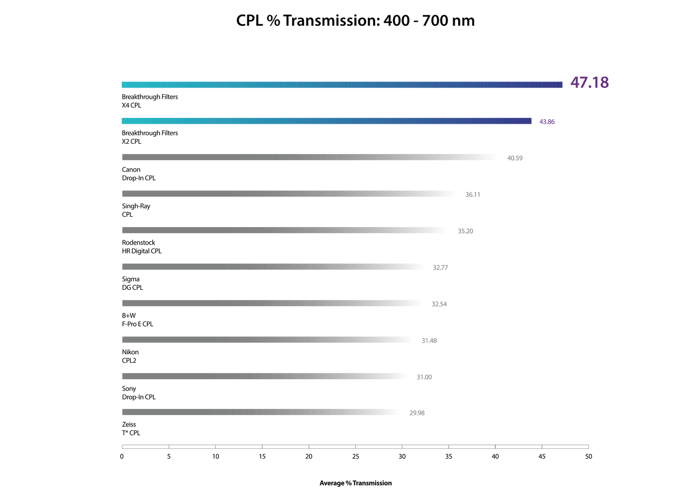 Increased average transmission also leads to better performance. Higher light transmission allows more light to pass through to the sensor, which translates into faster shutter speeds, sharper images and the ability to use a lower ISO when shooting video. The X4 CPL features the highest average light transmission - 47.18% - of any available CPL without sacrificing polarization efficiency.